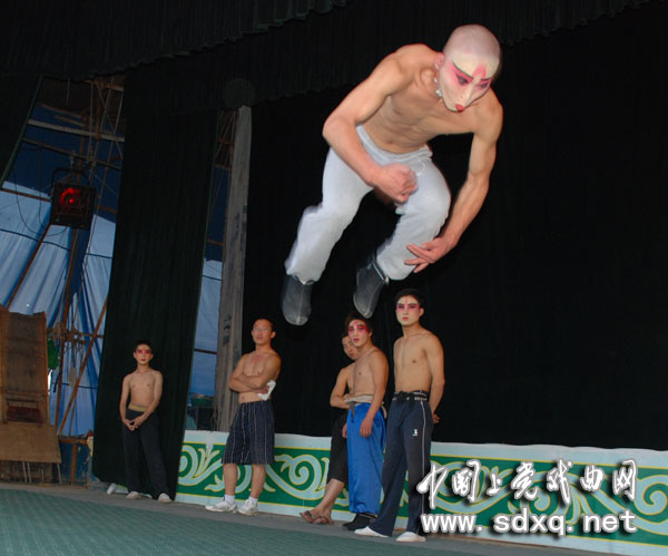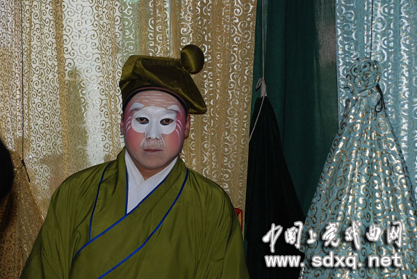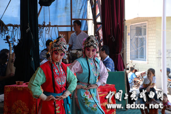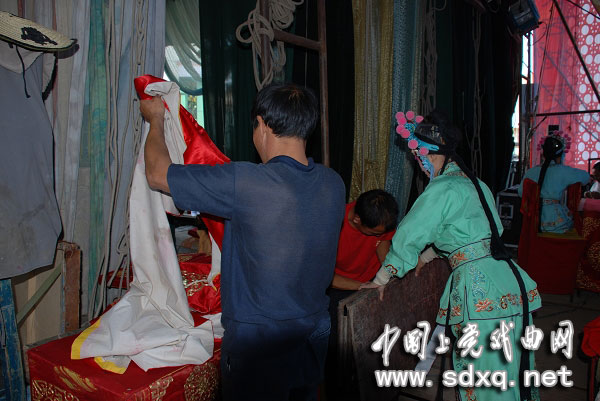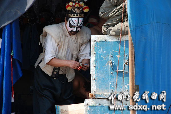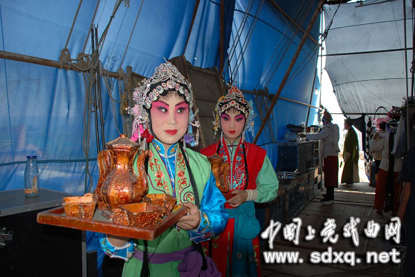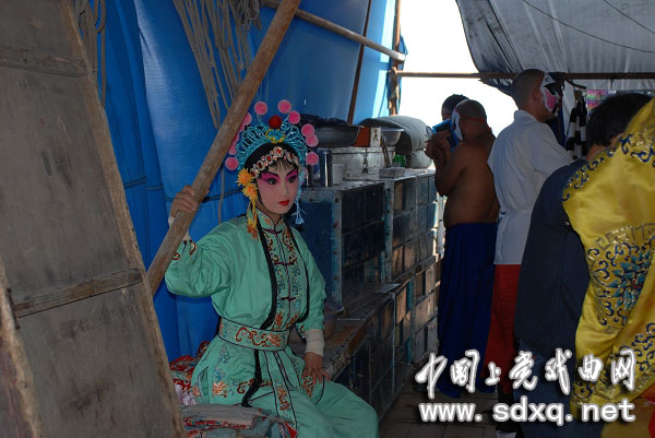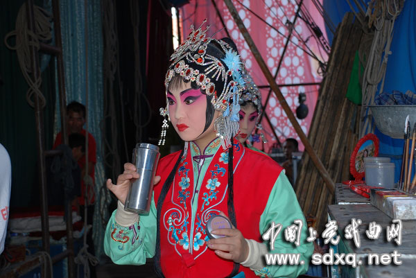 下午演的是《杨门女将》。演员已经化妆完毕,等待上场。