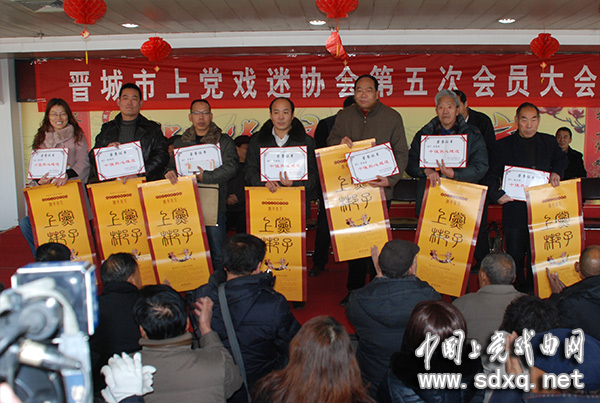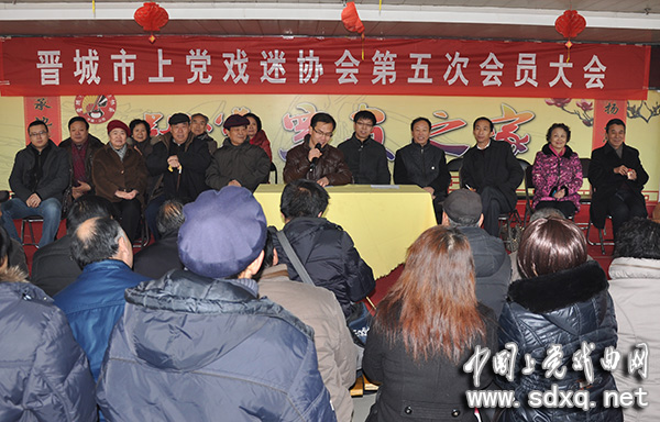 市上党戏剧研究院副院长郭孝明\吴国华,市上党梆子传习所所长张保平,市文广新局文化产业联合会秘书长李耀华,市上党戏迷协会名誉会长王和平、霍国安,市上党戏迷协会会长张付军,高平市上党戏迷协会会长蒋民富及马正瑞等6位老艺人在主席台就座并进行了热情洋溢地讲话。大会由协会副会长侯自强主持。